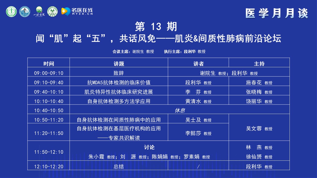 謝教授簡單介紹了“醫學月月談”的前身“腎病月月壇”的歷史,“腎病月月壇”是在疫情防控期間開展的線上學術交流活動,以腎臟病或系統性疾病腎損害的診治為主,每期一個主題,形式和內容都很受歡迎。為了讓更多的人受益,升級為“醫學月月談”。“醫學月月談”秉承“腎病月月壇”的優良傳統,聚焦醫學工作的熱點和難點,以臨床需求為導向,以解決臨床問題為目的,每月主辦1-2次線下和線上相結合的醫學交流活動,線下在全國的城市輪流舉辦,已成功舉辦12期醫學月月談。本期醫學月月談的主題是: 聞“肌”起“五”,共話風免——肌炎&間質性肺病前沿論壇,非常榮幸的邀請到江西省人民醫院段利華教授作為本期的執行主席,相信本期月月談將在段教授的引導下,在各位專家們的大力支持下,取得圓滿成功。